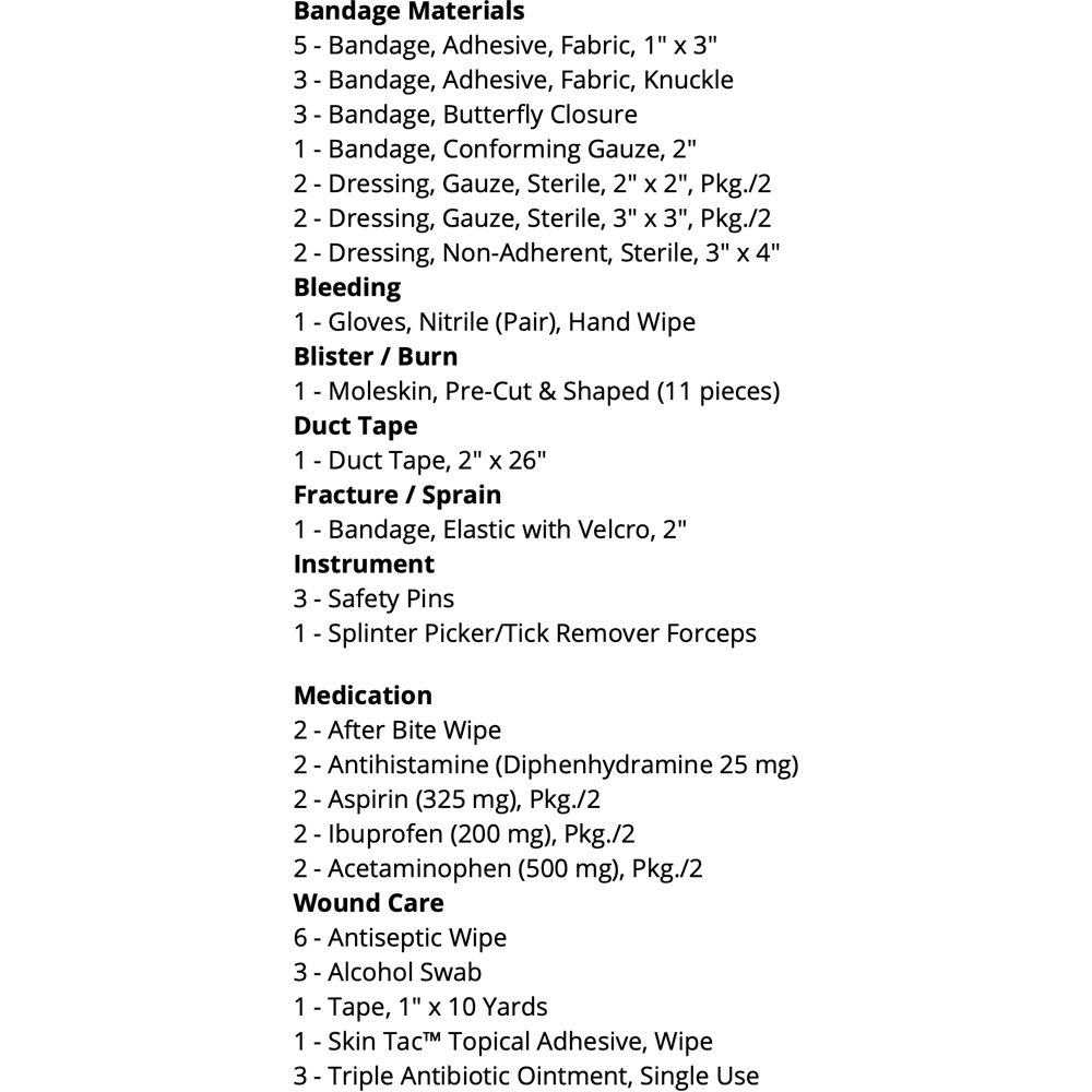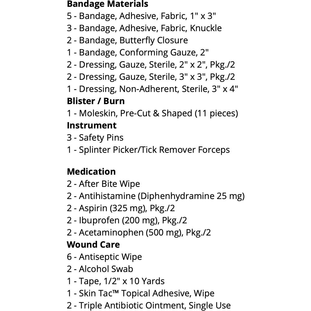 Offers basic wound and blister management supplies in a waterproof and ultra lightweight bag. See chart on website for contents.
