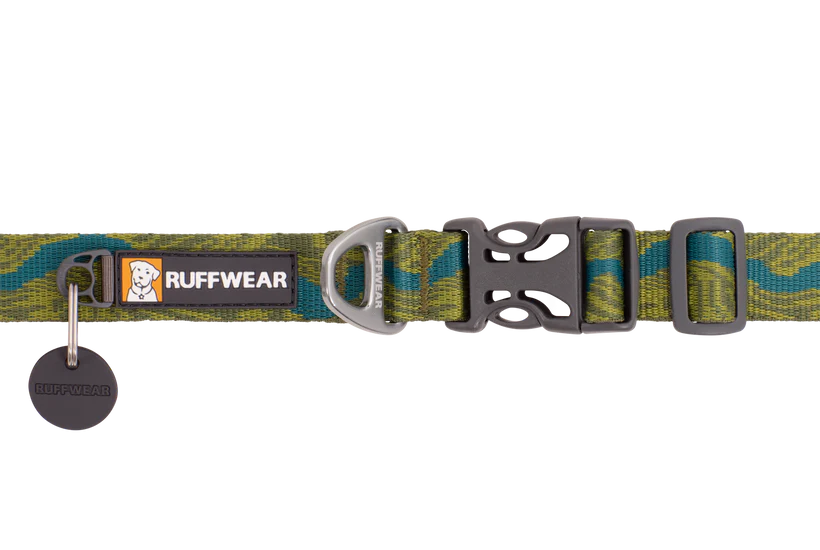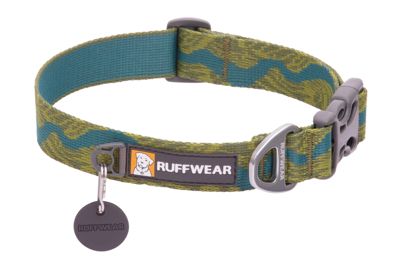 The Flat Out Collar is our everyday dog collar with an easy-to-use side-release buckle and outdoor-inspired patterns that connect you with your favorite wild spaces. It's packed full of Ruffwear's essential collar features: separate ID tag attachment point with tag silencer, strong and comfortable webbing, and an aluminum V-ring leash connection point.