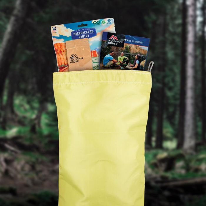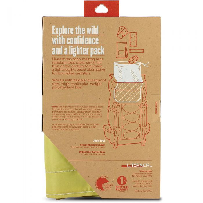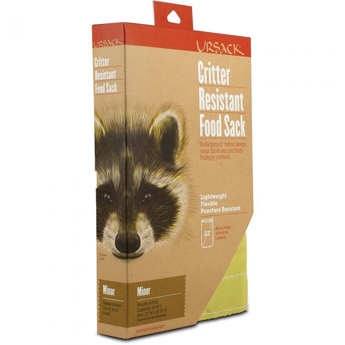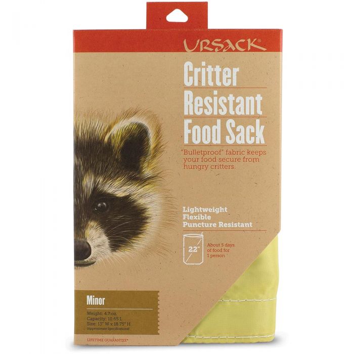 For critters–not bears. The Ursack Minor is made of a fabric woven from Kevlar “bullet proof” fiber. The highly cut resistant weave prevents sharp toothed critters from getting your food. Ursack Minor will NOT protect against the strength of a bear. The Minor weighs about 5 ounces, and is 8 inches in diameter, 13 inches tall and holds about 650 cubic inches. If packed only with freeze dried food, it will hold about 37 servings of breakfast, lunch and dinner. It comes with a Velcro closure and an integrated loop to clip a carabiner or tie a cord to.